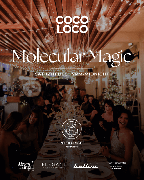 Join us this Christmas for a long-table evening where dining meets dancefloor. Indulge in an exceptional, imagination-led menu by Molecular Magic, served with a side of theatre and festive flair. As the night unfolds, Cocoloco sounds take over with DJ Mr H (Simon Hulton) joined by the irresistible rhythms of Havana Percussion, lifting the energy from elegant dinner to full celebration. A little spectacle, a little party — and the perfect excuse to dress up, gather your people and celebrate in style.